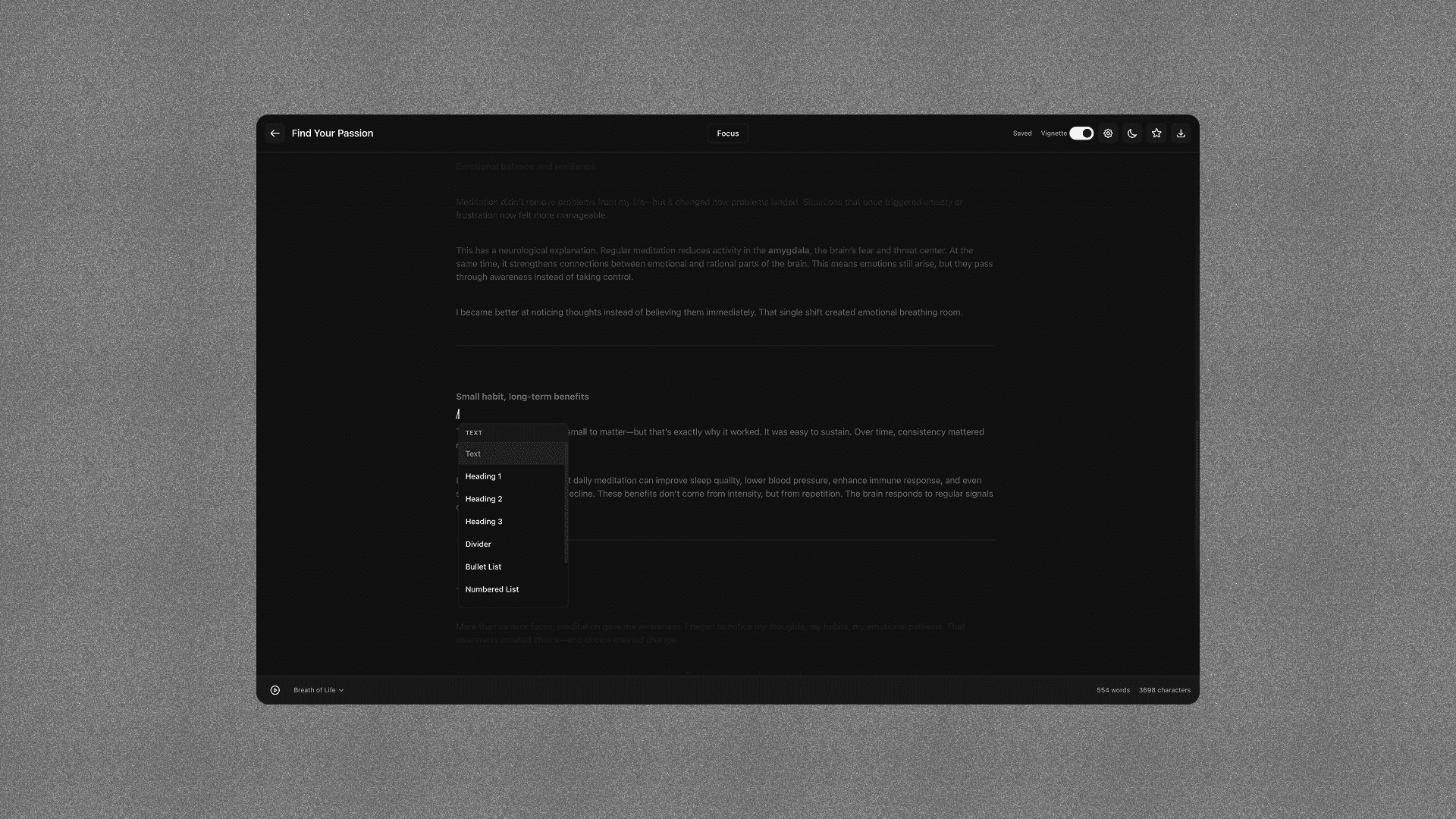 A calm, distraction-reduced writing experience validated through personal use and peer feedback
