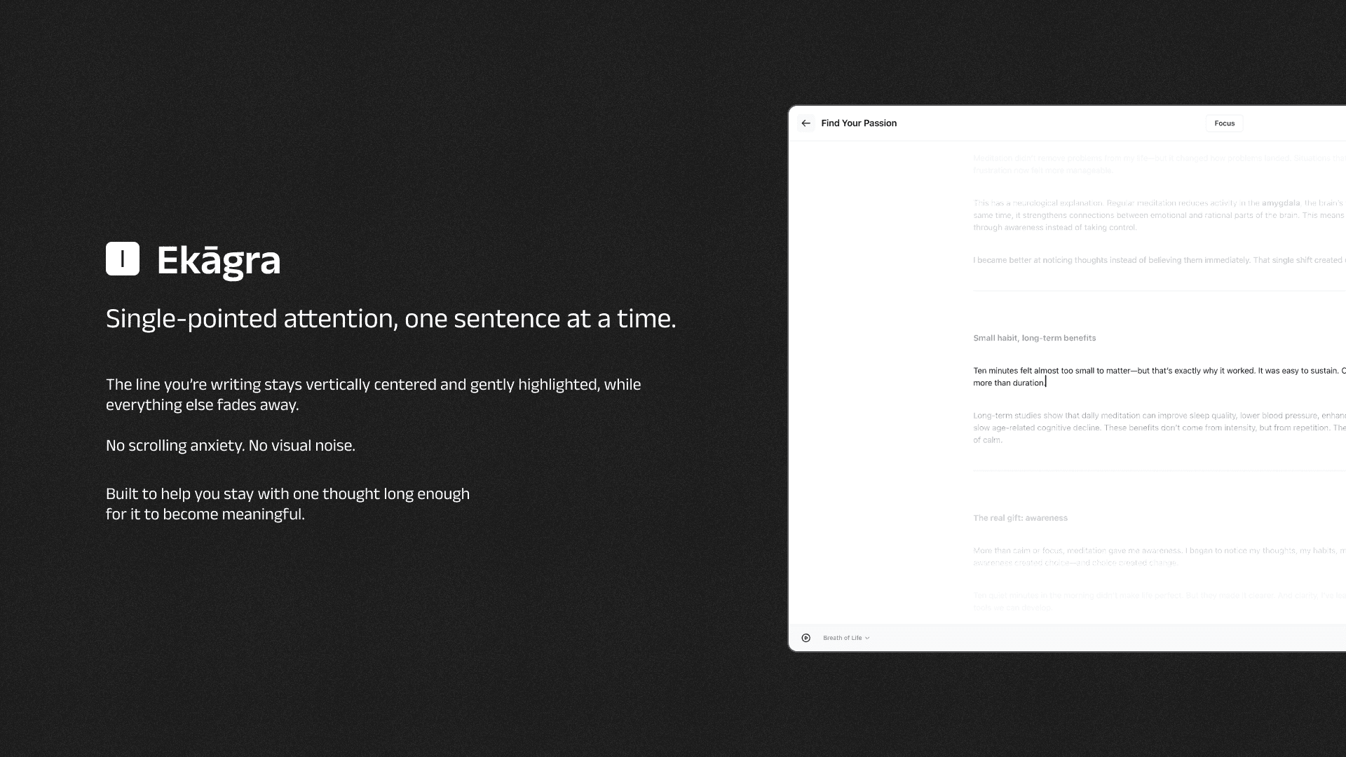 Ekāgra is a self-initiated writing tool built around a simple idea: most editors optimize for features, not for sustained attention. Over time, visual noise, constant decisions, and intrusive tools quietly disrupt flow.
